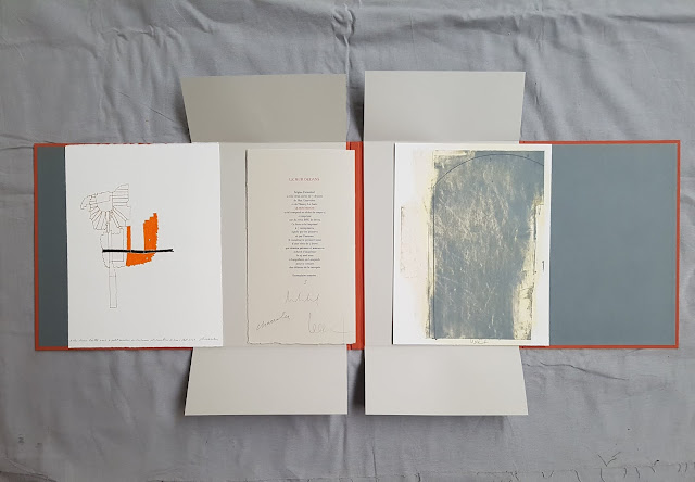 Régine Detambel a relié deux séries de 7 dessins de Max Charvolen et de Thierry Le Saëc. Le mur dedans a été composé en didot de corps 14 et imprimé sur du vélin BFK de Rives. Ce livre a été imprimé à 7 exemplaires, signés par les peintres et par l’auteure. Il constitue le premier tome d’une série de 7 livres qui réunira peintres et auteur.e.s. Achevé d’imprimer le 24 avril 2021 à Kergollaire en Languidic pour le compte des éditions de la canopée.